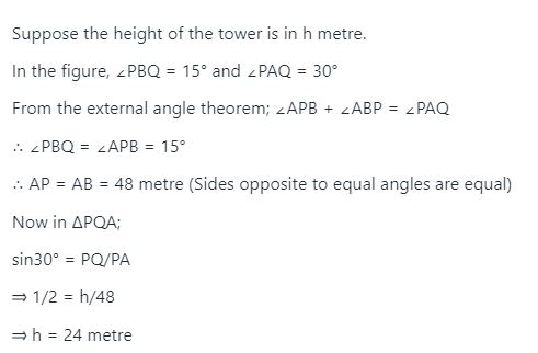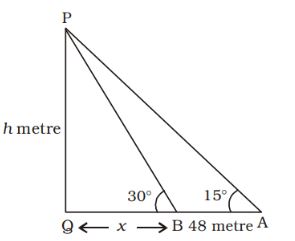 Example 3: The angle of elevation of the top of a tower from two points A and B lying on the horizontal through the foot of the tower are respectively 15° and 30°. If A and B are on the same side of the tower and AB = 48 metre, then the height of the tower is : a) 24√3m b) 24m c) 24√2m d) 96m