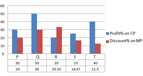 P => Profit% = 30% = 3/10 [CP = 10, SP = 10+3 = 13] Discount = 20% = 1/5 [MP = 5, SP = 5-1 = 4] Make SP same CP : SP : MP is 40 : 52 : 65 ………………(1) Now T =>Profit% = 40% = 4/10 [CP = 10, SP = 10+4 = 14] Discount = 12.5% = 1/7 [MP = 8, SP = 8-1 = 7] Make SP same CP : SP : MP is 10 : 14 : 16……………….(2) Make CP of P and T same by multiplying eq. (2) by 4, gives CP : SP : MP is 40 : 56 : 64 So 40 = 800 [as given in question] => 1 = 20 Difference in MP = 65-64 = 1, so => 1 = 20