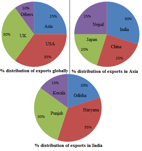 Exports by Punjab = 30% of 22.5 million $ = 6.75 million $ Global exports from above question is =300 million $ Required % = 6.75/300 * 100 = 2.25%