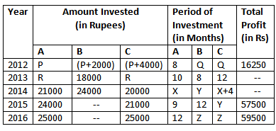 Study the following table carefully and answer the questions that follow: Three persons A, B, C invested different amounts in different years for different time period and shared profit from total profit given as per table. Some values are missing. Answer the questions on the basis of given table and information in question.