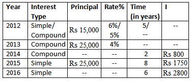 Study the following table carefully and answer the questions that follow: A person invested different amount in different years at different rate of interest for different years as described in below table. Some values are missing. Answer the questions on the basis of given table and information in question.