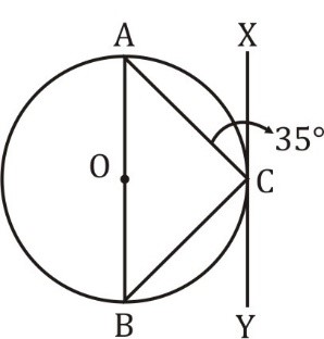 In the given figure, AB is a diameter of the circle with centre O and XY is the tangent at a point C. If ∠ACX = 35°, then what is the value (in degrees) of ∠CAB ?