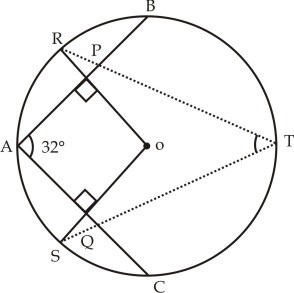 P and Q are mid points of AB and AC so OP and OS will be perpendicular at AB and AC respectively. ∴ ∠APO = ∠AQO = 90° ⇒ ∠ROS = 180° – 32° ∠ROS = 148° ∠RTS = 1/2 ∠ROS ∠RTS = 74°
