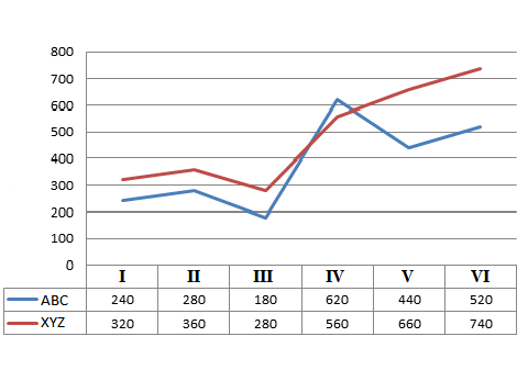 The chart shows the number of students in six 6 classes of 2 different schools ABC and XYZ.