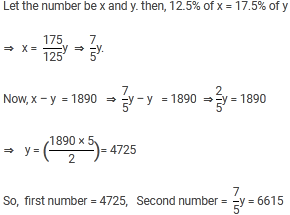 Difference of two numbers is 1890. If 12.5% of one number is 17.5% of the other number, Find the two numbers.