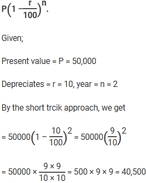 The value of a machine depreciates every year by 10%. If its present value is Rs. 50,000 then the value of the machine after 2 years is _____.