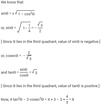 If cosΘ = – 1/2 and π < Θ < 3π, find the value of 4 tan2Θ – 3 cosec2Θ