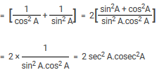 (1 – tan A)2 + (1 + tan A)2 + (1 – cot A)2 + (1 + cot A)2 = 1 + tan2 A – 2 tan A + 1 + tan2 A + 2 tan A + 1 + cot2 A – 2 cot A + 1 + cot2 A + 2 cot A = 1 + tan2 A + 1 + tan2 A + 1 + cot2 A + 1 + cot2 A = sec2 A + sec2 A + cosec2 A + cosec2 A [? 1 + tan2 A = sec2 A and 1 + cot2 A = cosec2 A ] = 2 (sec2 A + cosec2 A)