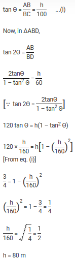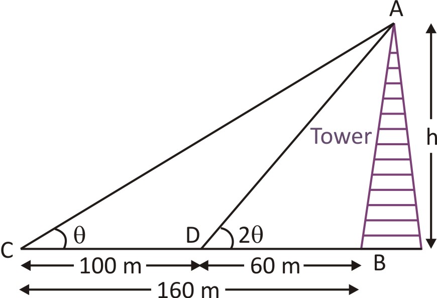 Given, BC = 160 m and CD = 100 m ∴ BD = BC – CD = 160 – 100 = 60 m Let, the height of the tower, AB = h metre And, ∠ACB = Θ and ∠ADB = 2Θ In ΔABC,