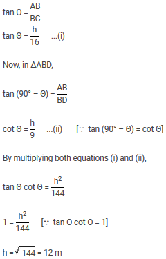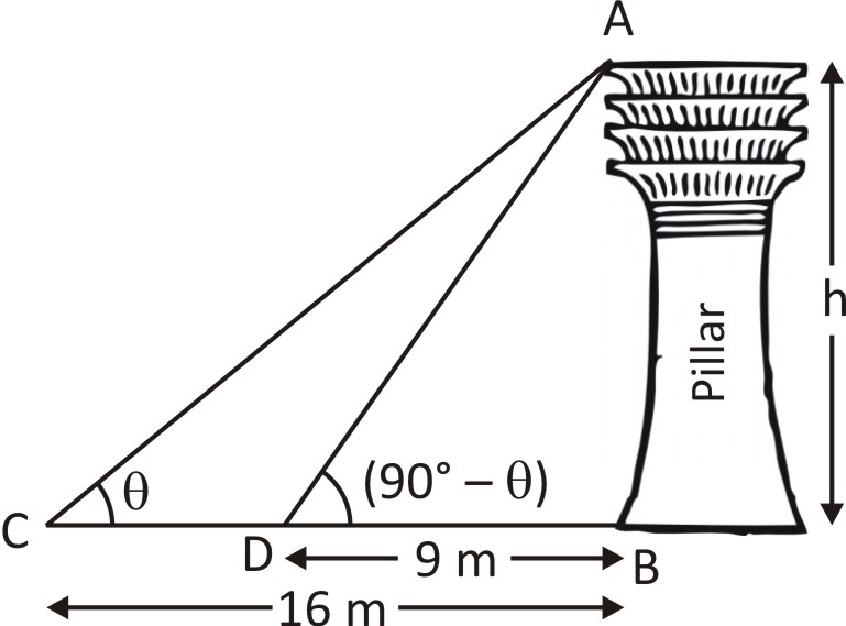 Given, distance BD = 9 m and BC = 16 m Let, the height of the pillar = h metre ∠ACB and ∠ADB are complementary. ∴ ∠ACB = Θ and ∠ADB = (90° – Θ) In ΔABC,