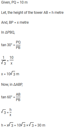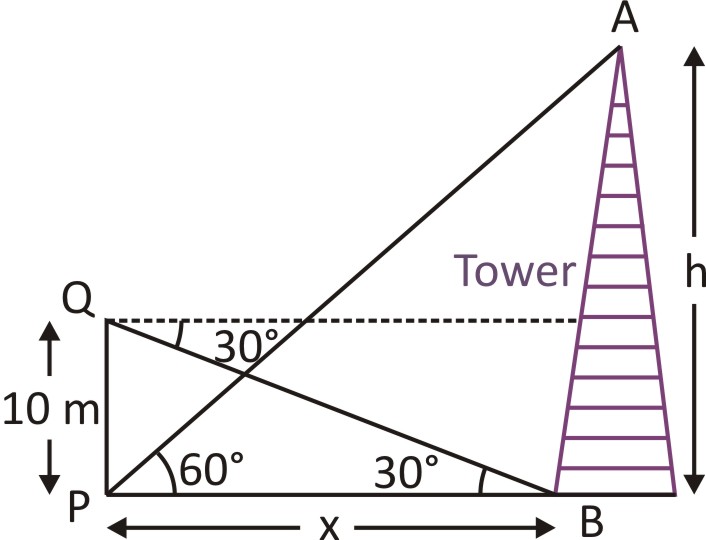 The angle of elevation of the top of a vertical tower situated perpendicularly on a plane is observed as 60° from a point P on the same plane. From another point Q, 10 m vertically above the point P, the angle of depression of the foot of the tower is 30°. The height of the tower isa