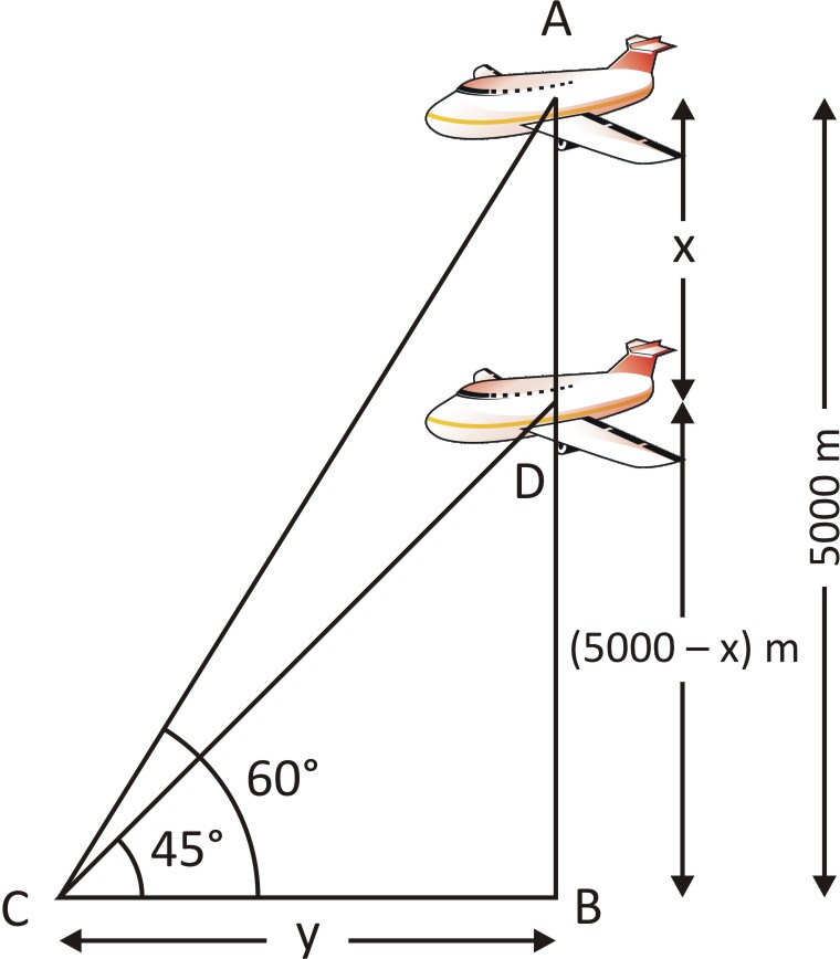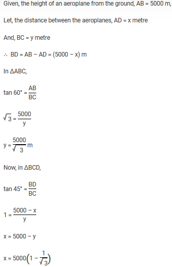 An aeroplane when flying at a height of 5000 m from the ground passes vertically above another aeroplane at an instant, when the angles of elevation of the two aeroplanes from the same point on the ground are 60° and 45° respectively. The vertical distance between the aeroplanes at that instant is