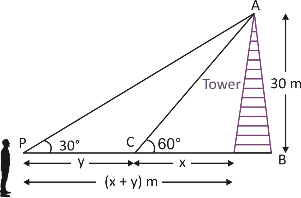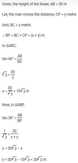 A man standing at a point P is watching the top of a tower, which makes an angle of elevation of 30°. The man walks some distance towards the tower and then his angle of elevation of the top of the tower is 60°. If the height of the tower is 30 m, then the distance he moves is