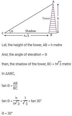 The shadow of a tower is √3 times its height. Then the angle of elevation of the top of the tower is