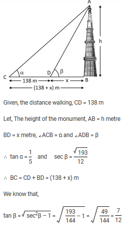 At a point on a horizontal line through the base of a monument, the angle of elevation of the top of the monument is found to be such that its tangent is 1/5. On walking 138 metres towards the monument the secant of the angle of elevation is found to be √193/12. The height of the monument (in meter) is
