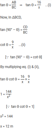 Given, AB = 16 m, CD = 9 m and BC = x metre And, ∠ACB and ∠CBD are complementary. ∴ Let, ∠ACB = Θ and ∠CBD = (90° – Θ) In ΔABC,