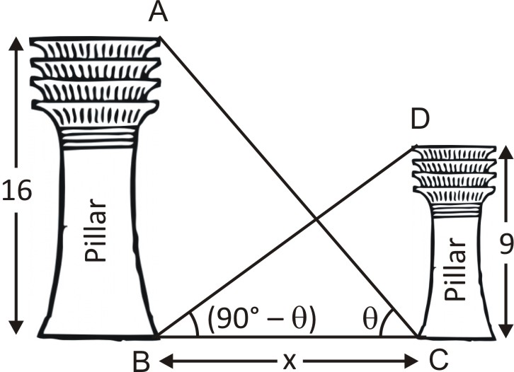 The distance between two pillars of length 16 metres and 9 metres is x metres. If two angles of elevation of their respective top from the bottom of the other are complementary to each other, then the value of x (in metres) is