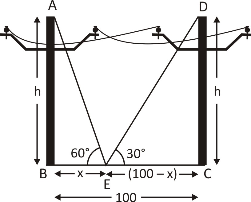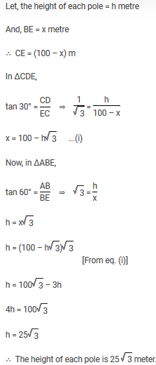 Two poles of equal height are standing opposite to each other on either side of a road which is 100 m wide. From a point between them on road, angle of elevation of their tops are 30° and 60°. The height of each pole (in metre) is