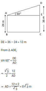 The top of two poles of height 24 m and 36 m are connected by a wire. If the wire makes an angle of 60° with the horizontal, then the length of the wire is