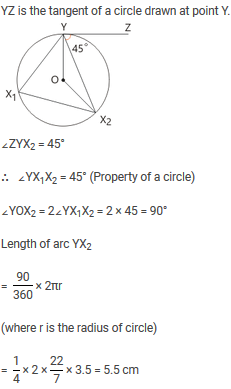A tangent YZ is drawn at any point Y of a circle of radius 3.5 cm. YX1 and YX2 are the two chords of this circle. If ∠ZYX2 = 45° and O is the centre of the circle, then the length of arc YX2 is (assume π = 22/7 )