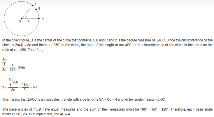 The points A, B and C lie on a circle that has radius 4. If the length of arc ABC is 4π/3. What is the length of line segment AC?