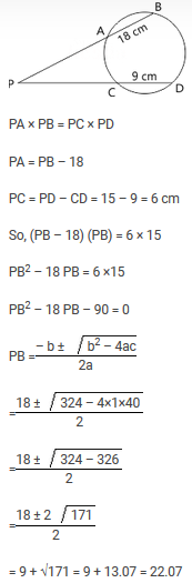 Chords AB and CD of a circle intersects externally at P. If AB = 18 cm, CD = 9 cm, and PD = 15 cm then the length of PB is