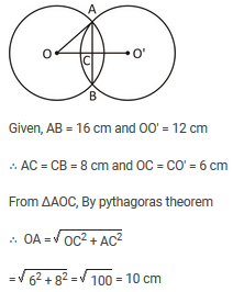 If two equal circles whose centres are O and O', intersect each other at the point A and B, OO' = 12 cm and AB = 16 cm, then the radius of the circle is