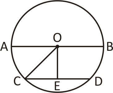 Diameter, AB = 20 cm ∴ Radius, AO = OC = 10 cm Chord, CD = 12 cm ∴ CE = ED = 6 cm In ΔCOE, By pythagoras theorem OE = √OC2 – CE2 = √102 – 62 = 8 cm