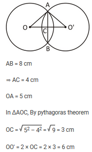 Two circles of same radius 5 cm, intersect each other at A and B. If AB = 8 cm, then the distance between the centre is :