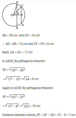 In a circle of radius 17 cm, two parallel chords of length 30 cm and 16 cm are drawn. If both the chords are on the same side of the centre, then the distance between the chords is