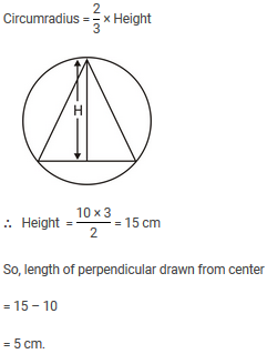A circle of radius 10 cm has an equilateral triangle inscrisbed in it. the length of the perpendicular drawn from the centre to any side of the triangle is