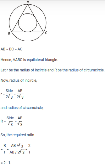 In a ΔABC, AB = BC = CA. The ratio of the radius of the circumcircle to that of the incircle is