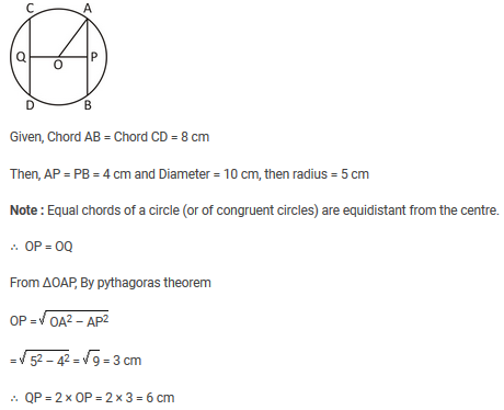 The distance betwen two parallel chords of length 8 cm each in a circle of diameter 10 cm is
