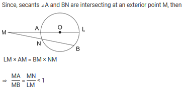 Consider a circle with centre at O and radius r. Points A and B lie on its circumference and a point M lies outside of it such that M, A and O lie on the same straight line. Then, the ratio of MA to MB is