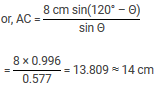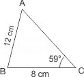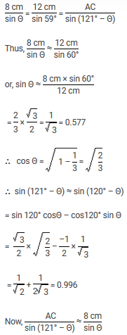 Given, AB = 12 cm, BC = 8 cm, ∠C = 59° Let ∠A = Θ ∴ ∠B = 180° – (59° + Θ) = 121° – Θ Now, let us see the choices. If AC = 12 cm, triangle would not be scalene. Hence, option A is ruled out. If AC = 10 cm, AB will become the largest side and ∠C the largest angle. But ∠C = 59°. Hence option B is ruled out. So, AC is either 14 cm or 16 cm. In any case, ∠B will be the largest angle and ∠A (say Θ) the smallest: Also, ∠B = 180° – (59° + Θ) = 121° – Θ By sine formula,