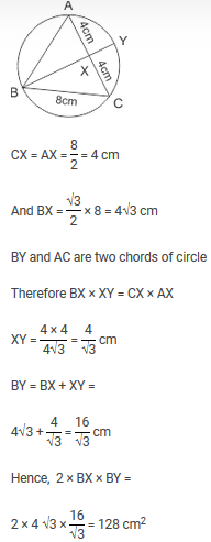 ABC is an equilateral triangle inscribed in a circle with AB = 8 cm. Suppose bisector of angle B meets AC at X and circle at Y, then what is the value of 2 × BX × BY?