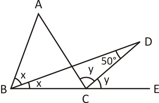 We know that, Exterior angle is sum of opposite interior angles ∴ ∠ACE = ∠A + ∠ABC ⇒ 2y = ∠A + 2x ⇒ ∠A = 2y – 2x ...(i) Similarly, ∠DCE = ∠DBC + ∠BDC ⇒ y = x + 50° From equation (i) ∠A = 2(x + 50°) – 2x = 2x + 100° – 2x = 100°