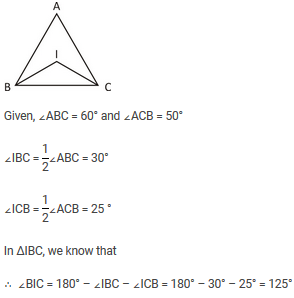 I is the incentre of ΔABC, ∠ABC = 60° and ∠ACB = 50°. Then ∠BIC is :
