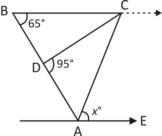 ⇒ ∠CBA = ∠CAB = 65° Now, ∠EAB = ∠EAC + ∠CAB ⇒ 115° = x + 65° ⇒ x = 50°.