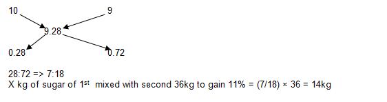 How many Kg of sugar costing Rs. 10kg must be mixed with 36Kg of sugar costing Rs.9 per Kg ,so that there may be gain of 11% by selling the mixture of Rs.10.30 per Kg?