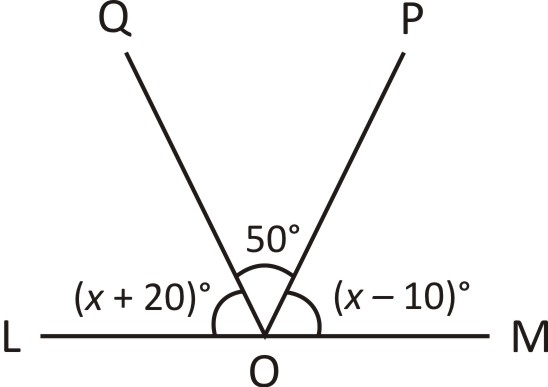 From the given figure, ∠LOQ + ∠QOP + ∠POM = 180° (straight line) ∴ (x° + 20°) + 50° + (x° – 10°) = 180° ⇒ 2x° + 60° = 180° ⇒ 2x° = 120° ∴ x° = 60°