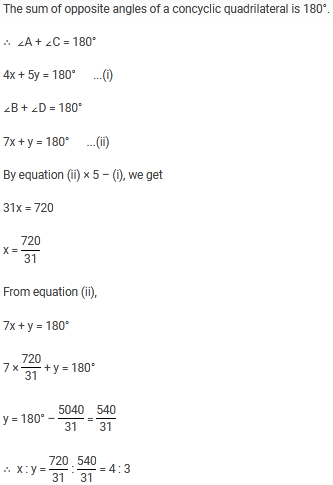 If ABCD be a cyclic quadrilateral in which ∠A = 4x°, ∠B = 7x°, ∠C = 5y°, ∠D = y°, then x : y is