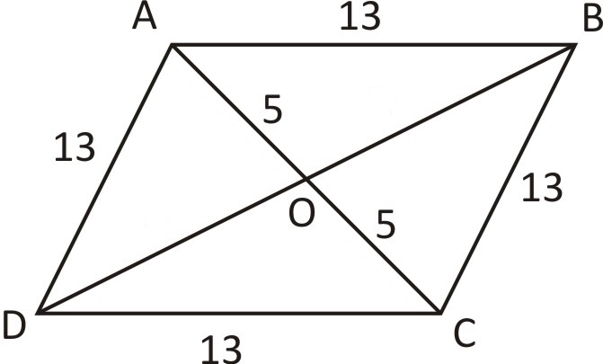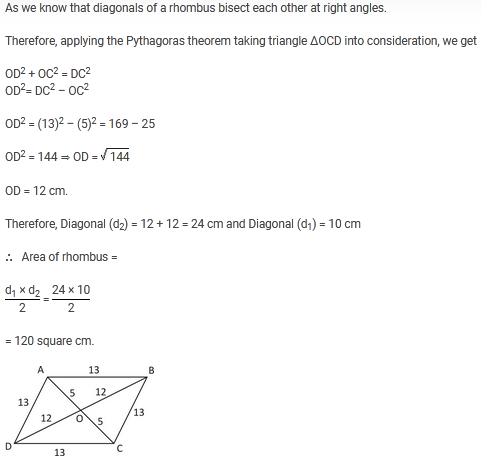 The area of a rhombus with side of 13 cm and one diagonal 10 cm will be