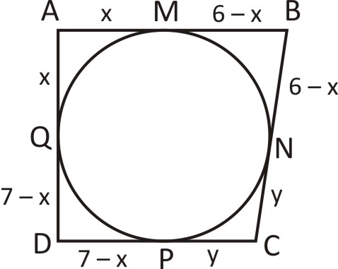 We know tangents drawn to a circle from same external point are equal AM = AQ = x (let) ∴ MB = 6 – x = BN QD = 7 – x = DP PC = y (let) = CN Now, CD = DP + PC = 5 ⇒ 7 – x + y = 5 ⇒ y – x = – 2 BC = CN + BN = y + 6 – x = y – x + 6 = – 2 + 6 = 4