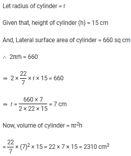 The height of a cylinder is 15 cm. The lateral surface area is 660 sq cm. Its volume is