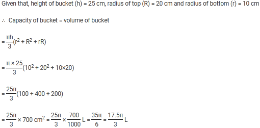 A bucket is of a height 25 cm. Its top and bottom radii are 20 cm and 10 cm, respectively. Its capacity (in L) is