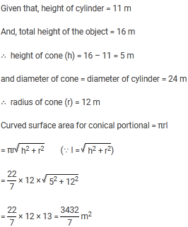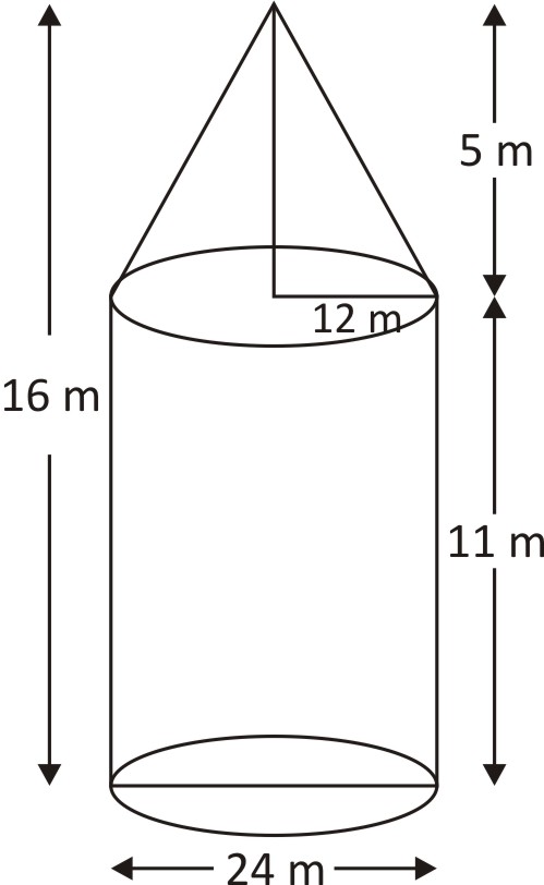 A tent is in the form of a right circular cylinder surmounted by a cone. The diameter of the cylinder is 24 m. The height of the cylindrical portion is 11 m, while the vertex of the cone is 16 m above the ground. What is the area of the curved surface for conical portion ?