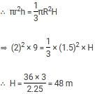 Given that, height of cylinder (h) = 9 m and diameter of cylinder = 4 m ∴ radius of cylinder (r) = 2 m And, diameter of cone = 3 m ∴ radius of cone (R) = 1.5 m Let height of cone = H Note : When an object is melted and given a different shape, the volumes of both the objects (of two different shapes) remain equal. Volume of cylinder = Volume of cone