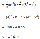 Given, internal diameter of hollow sphere = 4 cm, then internal radius (r) = 2 cm And, external diameter of hollow sphere = 8 cm, then external radus (R) = 4 cm Diameter of cone = 8 cm, then radius of cone (r1) = 4 cm Let height of cone = h Note : When an object is melted and given a different shape, the volumes of both the objects (of two different shapes) remain equal. ∴ Volume of cone = Volume of hollow sphere