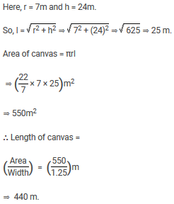 Find the length of canvas 1.25 m wide required to build a conical camp of base radius 7 metres and height 24 metres.